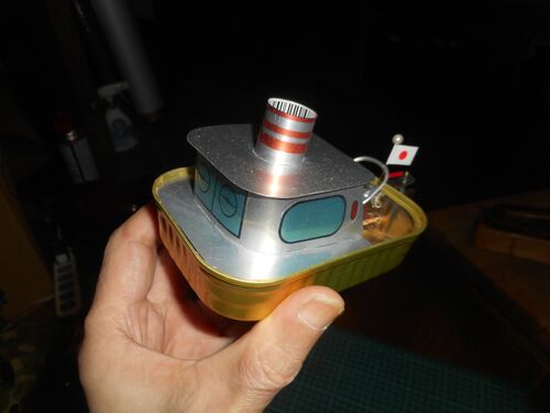 船体が一応完成したので取り敢えず失敗ボイラーを乗せました。失敗ボイラーはポンポン音無しですが推力はテスト済みで船は進むと思います。 それではロウソク立てほか一部エポキシ接着剤を使ってるので完全に固まったら試運転してみます。 なお、ボイラーは…